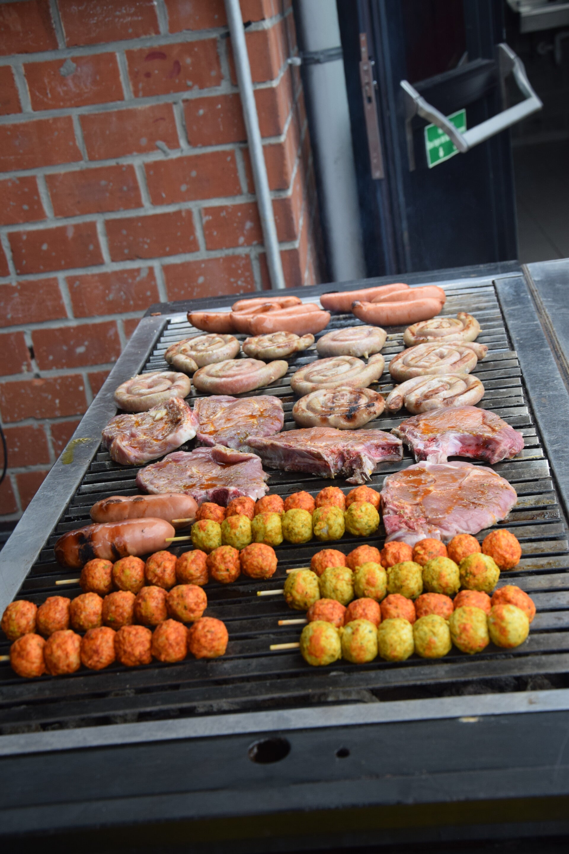 Kofte, western steak, Adana kebab, gemarineerde lamskotelet, gemarineerde steak, gemarineerd vers spek, gemarineerde spareribs, witte worst, kipsaté , gemarineerde spekrolletjes, gemarineerde hals kotelet (spiering)